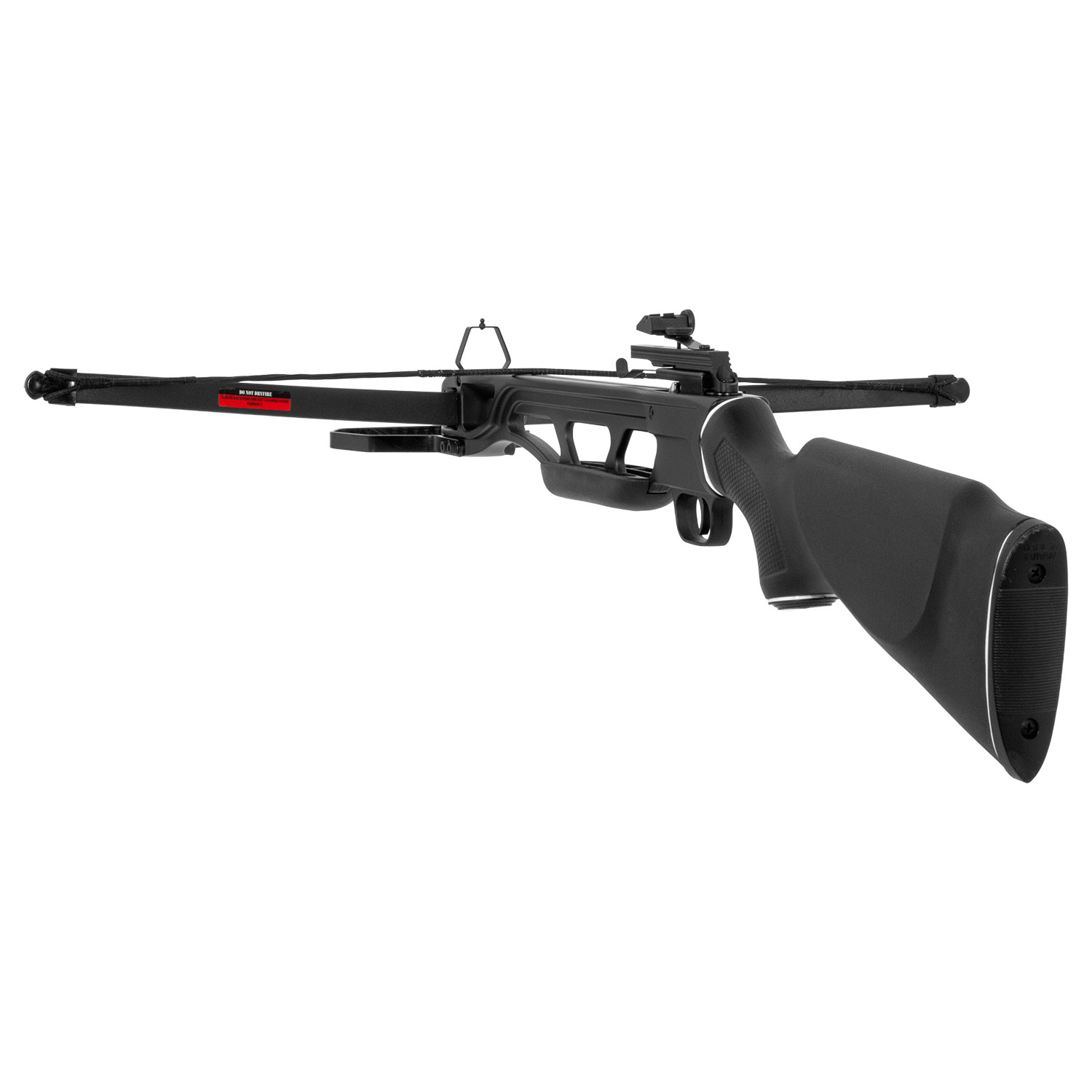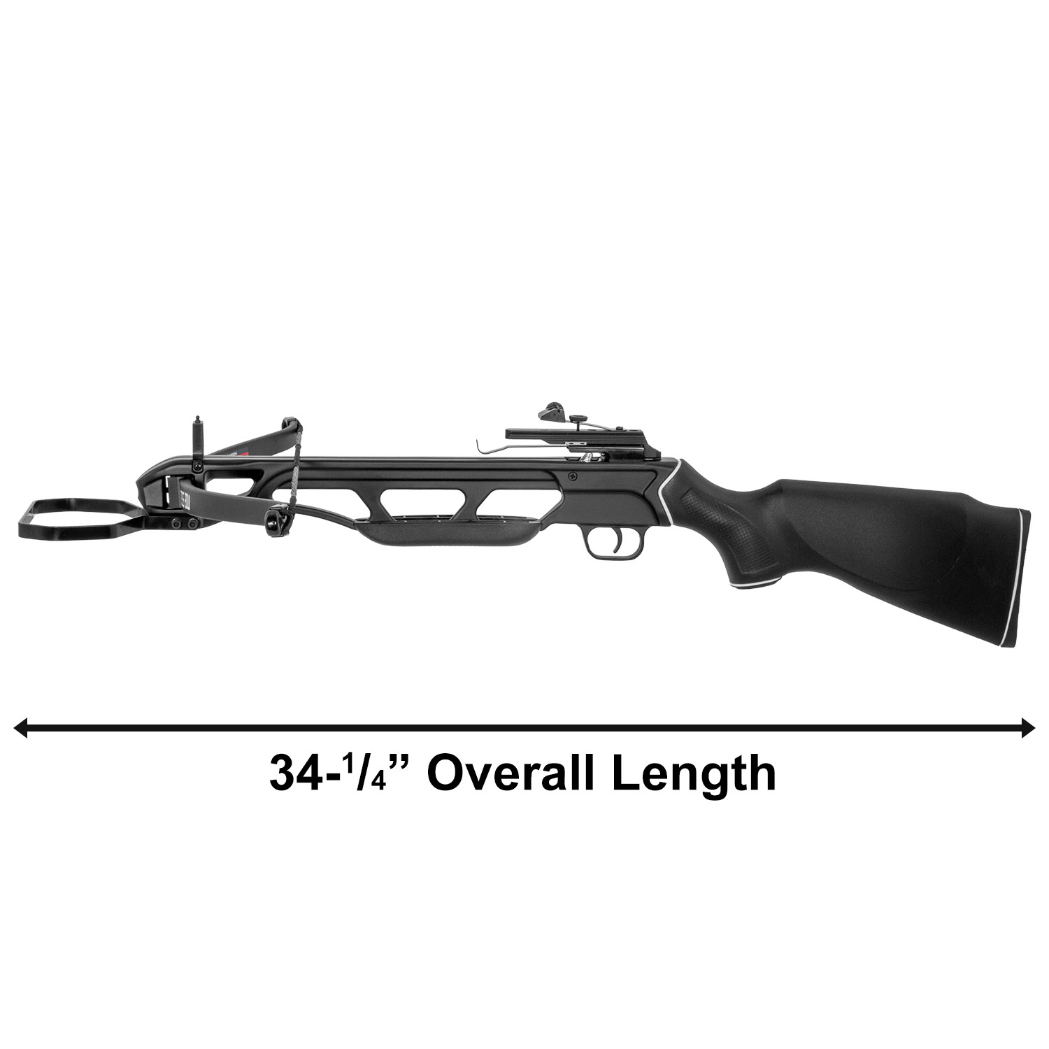 Product SummaryElevate your archery adventures with the 150-lb. MK-150A1PB Recurve Crossbow, a powerhouse designed for precision and reliability in every shot. This 150-lb black crossbow boasts a rugged high-impact plastic body paired with cutting-edge fiberglass limbs, ensuring lightweight maneuverability without sacrificing strength. Achieving blistering speeds of 210 FPS, it excels in target practice and small game pursuits, reaching accuracies up to 45 meters with ease. Complete with two premium 16-inch aluminum arrows and an intuitive automatic safety, this model prioritizes user confidence and seamless operation. Its adjustable dovetail-mounted sight offers versatility for peep sighting or scope upgrades, making it a versatile pick for novices and experts seeking top-tier performance at an accessible price. High-Impact Plastic Body for Unmatched DurabilityEngineered from tough composite materials, the high-impact plastic stock withstands rigorous field use and rough handling, providing a stable platform that enhances shot consistency and longevity in diverse conditions. High-Tech Fiberglass Limbs for Explosive PowerThese advanced fiberglass limbs deliver exceptional energy transfer, propelling arrows with remarkable force while maintaining flexibility and resistance to environmental wear for sustained peak performance. Blazing 210 FPS Velocity for Pinpoint AccuracyClocking in at 210 feet per second, this crossbow ensures flat trajectories and effective range, ideal for ethical hunting or competitive shooting where every second counts in hitting distant targets. Automatic Safety and Adjustable Dovetail SightBuilt-in automatic safety prevents dry fires, while the dovetail rail supports an easy-to-use adjustable sight or scope attachment, allowing quick calibrations for personalized aiming precision. Ready-to-Hunt Package with Two Aluminum ArrowsOutfitted with two durable 16-inch aluminum arrows optimized for this recurve design, the kit gets you shooting right away, minimizing setup time and maximizing your focus on the thrill of the hunt. Features