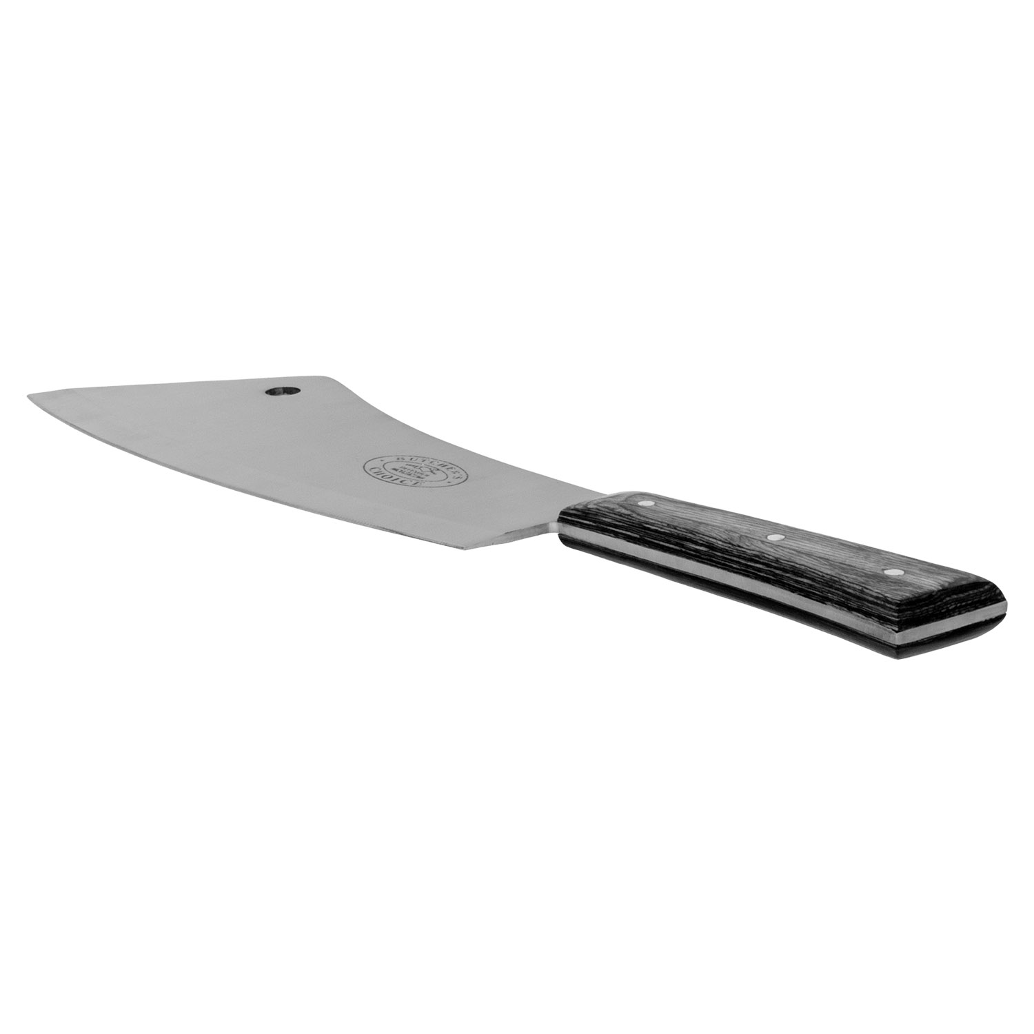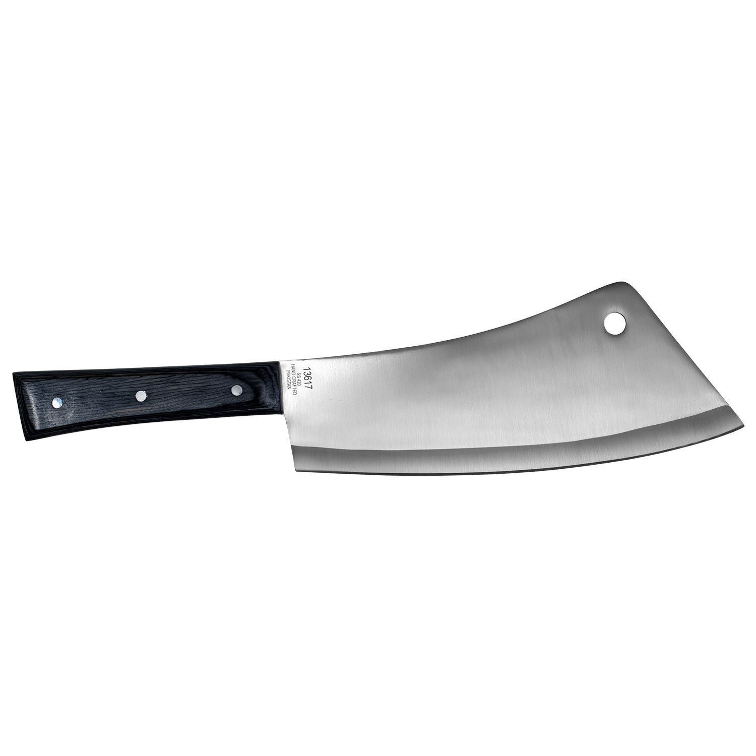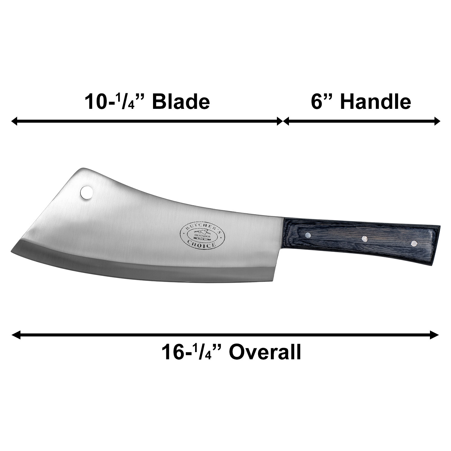 Product SummaryDominate your kitchen or butcher block with this powerful 16-1/4" Butcher's Choice Cleaver Knife, expertly designed for heavy-duty chopping and precise cutting. Crafted with a robust 420 stainless steel blade, this cleaver delivers exceptional sharpness and durability for tackling large cuts of meat, poultry, bones, and vegetables. The elegant ebony wood handle provides a comfortable, secure grip that reduces fatigue during extended use. Hand crafted in Pakistan, this full tang cleaver combines traditional craftsmanship with modern reliability, making it a top choice for professional butchers and home chefs alike. Built to handle demanding tasks while maintaining its edge, it stands out as a versatile and long-lasting essential in any cutting arsenal. Premium 420 Stainless Steel BladeThe high-quality 420 stainless steel construction ensures superior rust resistance, outstanding edge retention, and effortless chopping through tough materials like bone and frozen meat. Full Tang Design for Maximum StrengthFeaturing full tang construction that extends through the entire handle, this cleaver offers unmatched balance, durability, and power for heavy-duty use without risk of breakage. Luxurious Ebony Wood HandleThe rich ebony wood handle delivers a sophisticated look and feel, with a comfortable ergonomic grip that enhances control and reduces hand strain during prolonged cutting sessions. Generous Cleaver DimensionsWith a substantial 10-1/4 inch blade and 6 inch handle for a total overall length of 16-1/4 inches, this cleaver provides the reach and heft needed for efficient butchering and kitchen prep. Hand Crafted QualityExpertly hand crafted in Pakistan, this Butcher's Choice cleaver reflects superior artisan skill, offering reliability and performance that outperforms many mass-produced alternatives. Features
