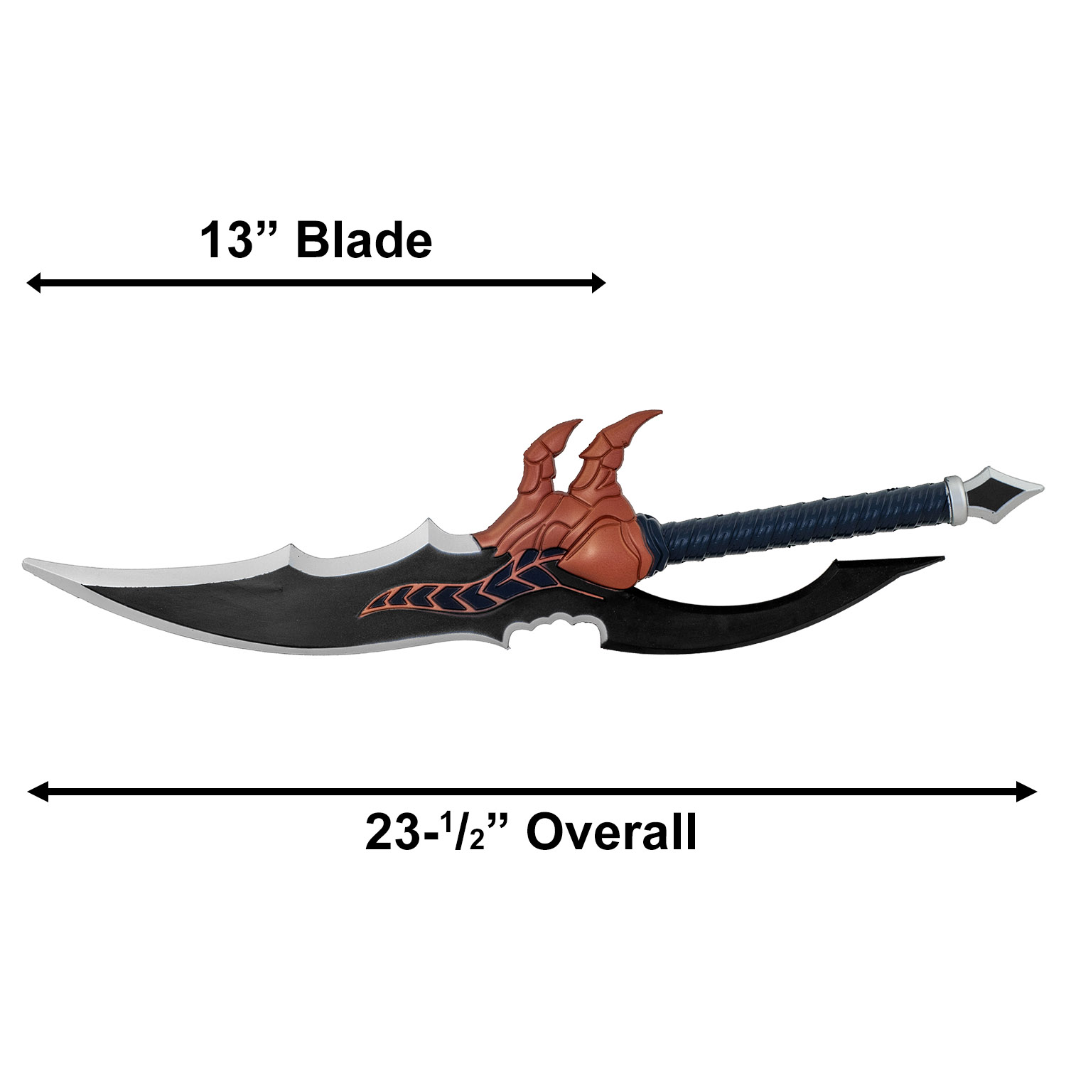 Product SummaryChannel the raw power of Sung Jin-Woo with this impressive Solo Leveling Kasaka's Venom Fang Cosplay Foam Dagger, a meticulously crafted replica of the venomous serpent boss weapon from the hit series. This full-size prop captures the dagger's savage, fang-inspired design with dramatic curves, intricate detailing, and fierce aesthetics that make it instantly recognizable to fans. Constructed from lightweight yet resilient high-density foam, it offers safe, comfortable handling for extended wear at conventions or photoshoots without the hazards of metal alternatives. The striking color scheme, including the dark blade, contrasting accents, and textured claw guard, brings authentic anime energy to your cosplay ensemble. Ideal for collectors, role-players, or anyone seeking a standout piece that embodies the thrilling hunter progression in Solo Leveling. High-Density Foam ConstructionCrafted from premium high-density foam, this dagger provides exceptional durability and a realistic weight feel while remaining completely safe for cosplay, conventions, and display purposes. Extreme Anime-Accurate DetailingFaithfully recreates Kasaka's Venom Fang with a menacing curved black blade, contrasting edge highlights, monstrous claw-inspired guard, and textured wrapping for an authentic, high-impact look straight from Solo Leveling. Full-Size Replica DesignAt 23-1/2 inches overall, this imposing dagger delivers the commanding presence of the original weapon, making it perfect for immersive cosplay as Sung Jin-Woo or dramatic photo opportunities. Lightweight and Comfortable for Extended UseThe foam build ensures easy handling during long events, reducing fatigue while maintaining a sturdy, professional appearance that stands out among other props. Versatile for Cosplay and DisplayWhether completing your Solo Leveling hunter outfit, enhancing a collection, or serving as eye-catching decor, this dagger offers unmatched versatility for fans and enthusiasts alike. Features