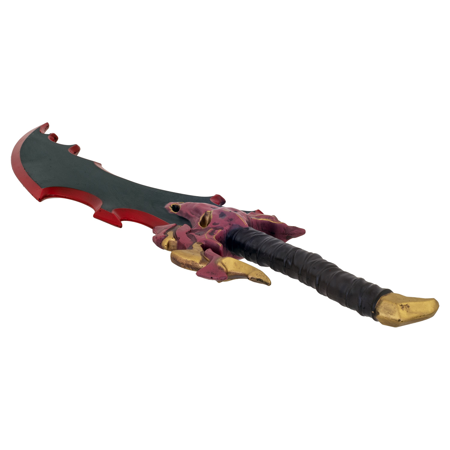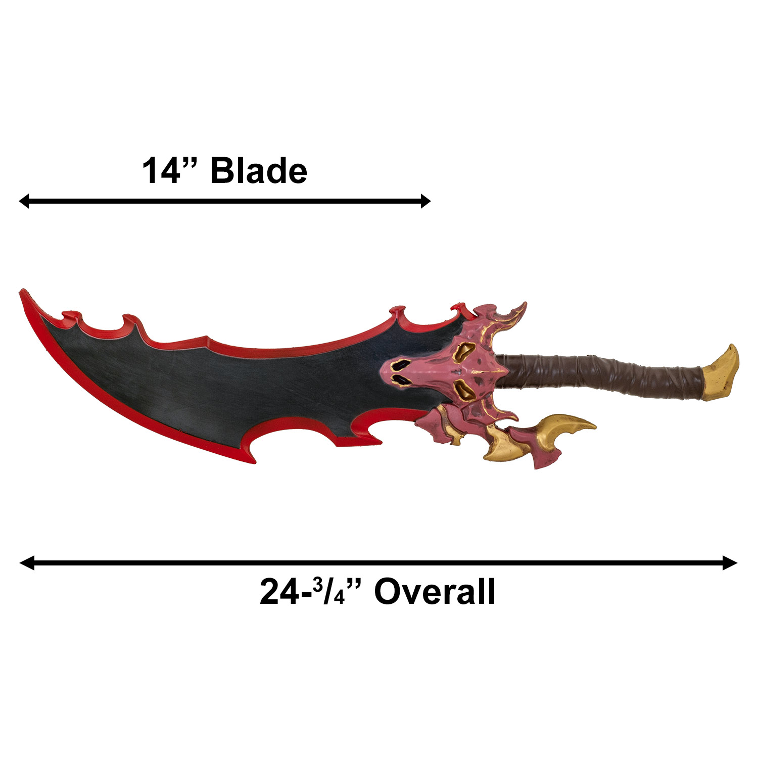 Product SummaryEmbody the overwhelming might of the Shadow Monarch with this ferocious Solo Leveling Demon King's Skull Cosplay Foam Dagger, a jaw-dropping replica of the legendary daggers once belonging to Baran, the Monarch of White Flames. This imposing prop captures the terrifying demonic essence with its skull-shaped guard featuring glowing eye-like voids, jagged red accents, and golden claw protrusions that scream otherworldly power straight from the series. Made from high-density foam, it delivers authentic scale and presence without the weight or danger of metal versions, perfect for dynamic poses, long convention days, or dramatic reenactments. The bold color palette of black blade, vivid red borders, crimson skull elements, and textured brown handle creates an instantly recognizable silhouette that elevates any Solo Leveling cosplay to elite status. A top choice for dedicated fans, hunters-in-training, or collectors who demand extreme detail and commanding visual impact in their arsenal. High-Density Foam ConstructionBuilt from premium high-density foam, this dagger offers outstanding durability, realistic heft, and complete safety for vigorous cosplay, photoshoots, or display without risking injury or damage. Extreme Demonic DetailingFaithfully replicates the Demon King's Daggers with a menacing black blade edged in red, a detailed skull guard in crimson tones with hollow eyes, golden claws, and intricate monstrous textures for unmatched anime authenticity. Full-Size Imposing ReplicaMeasuring 24-3/4 inches overall with a 14-inch dramatic curved blade, this dagger commands attention and perfectly matches the larger-than-life scale of Sung Jin-Woo's arsenal in Solo Leveling. Comfortable Wrapped HandleThe textured brown wrapped grip provides excellent control and comfort during extended wear, ensuring the prop feels secure in hand for action poses or prolonged events. Ultimate Cosplay and Collection PieceWhether channeling the Shadow Monarch's power at conventions, enhancing your Solo Leveling display, or standing out in group photos, this dagger delivers fierce presence and superior craftsmanship that outshines basic replicas. Features