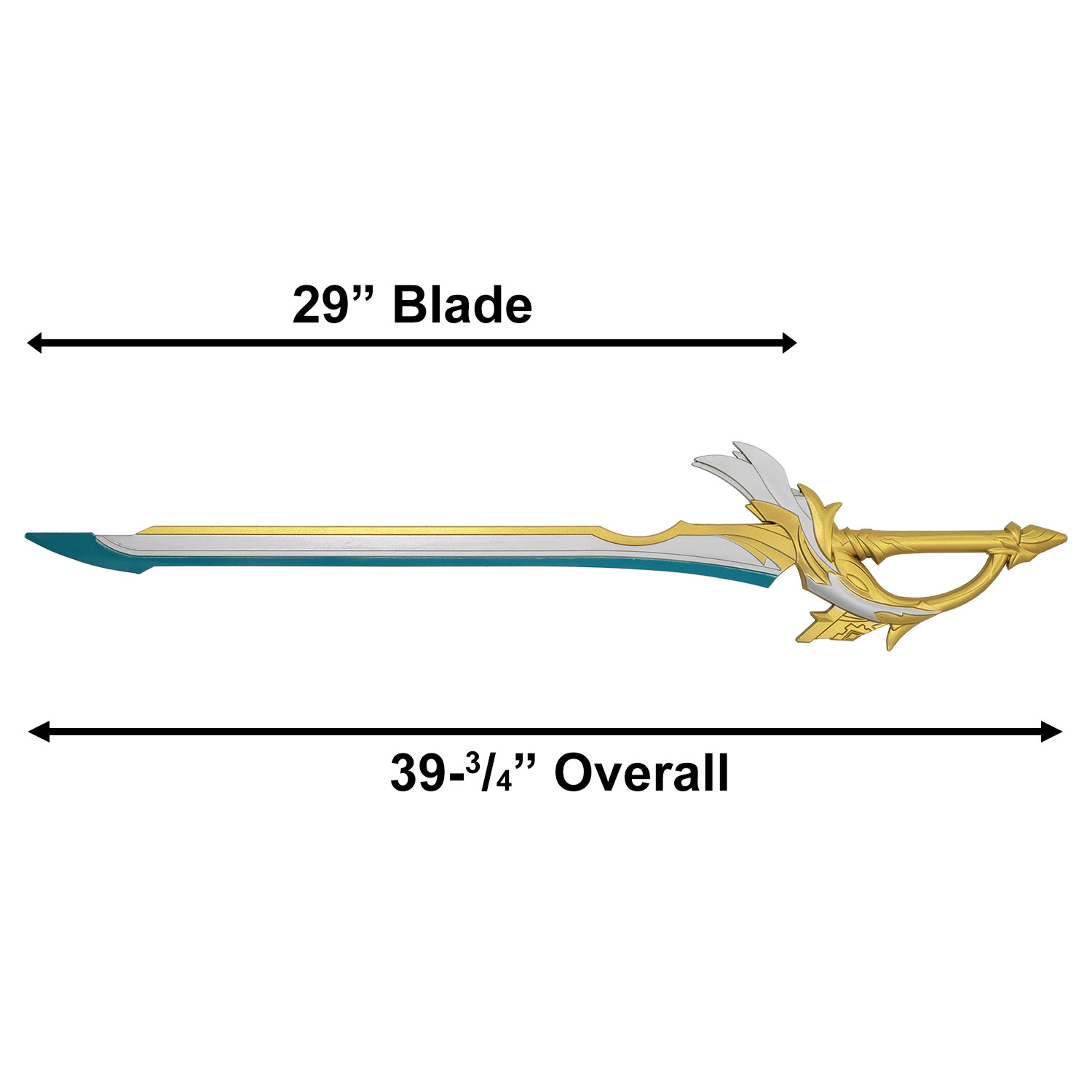 Product SummaryBring the legendary power of Mondstadt to life with this 39.75" Aquila Favonia Sword Foam Replica - Genshin Impact Cosplay Weapon. Expertly designed as a full-size replica of the iconic 5-star sword from Genshin Impact, this piece captures the essence of the Knights of Favonius and the falcon spirit of Vennessa. Crafted from high-density foam, it offers a safe yet highly detailed option for cosplay enthusiasts, collectors, and fans who want to wield justice and freedom without worry. The striking design features a teal and silver blade accented with ornate gold and white elements that mirror the game's signature aesthetic. Perfect for conventions, photoshoots, or display, this replica delivers impressive scale and intricate detailing that stands out among other cosplay weapons. High Density Foam ConstructionMade with premium high-density foam, this Aquila Favonia replica provides a lightweight and durable build that resists wear while maintaining a realistic appearance and feel for extended cosplay sessions. Full Size Highly Detailed ReplicaWith a 29-inch blade and 39-3/4 inch overall length, this accurately scaled sword showcases intricate gold and white hilt details, feather-like accents, and a teal blade edge that faithfully recreates the Aquila Favonia design from Genshin Impact. Ornate Falcon-Inspired Hilt DesignThe elaborate guard and pommel feature elegant gold accents paired with white wing and feather motifs, evoking the falcon spirit and winds of justice central to the sword's lore in the Knights of Favonius. Ideal for Genshin Impact CosplayDesigned specifically for fans of Genshin Impact, this safe foam weapon allows you to embody characters associated with Mondstadt's heroic legacy while prioritizing comfort and portability for events and displays. Features