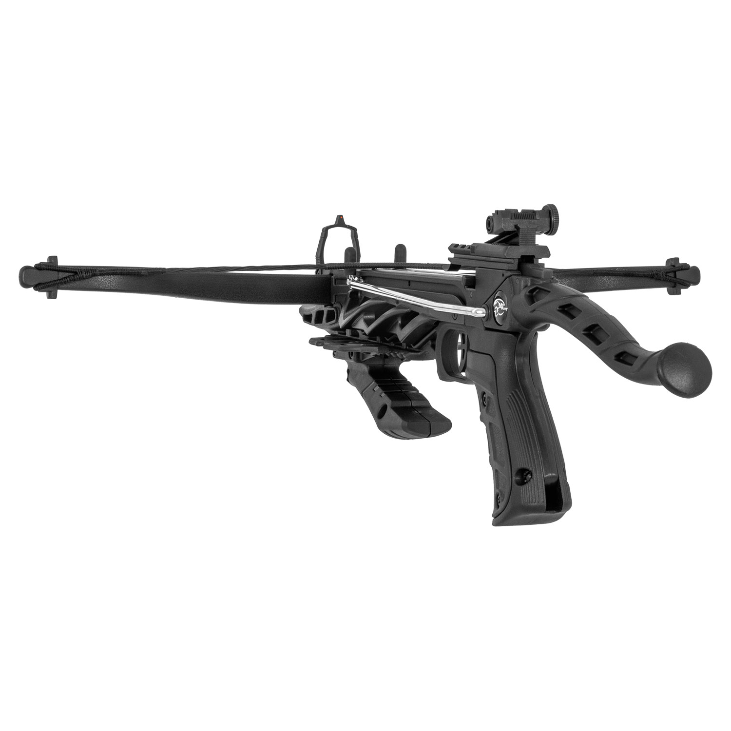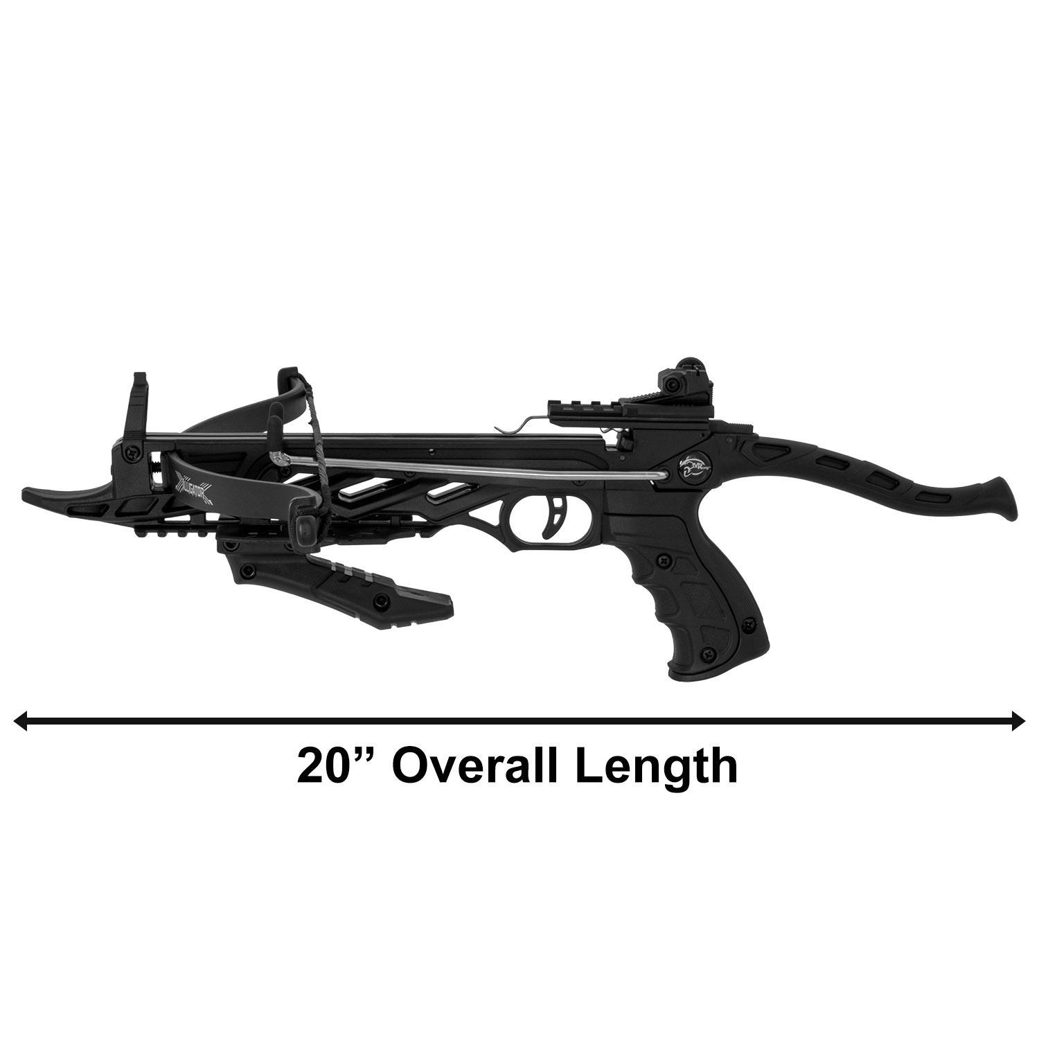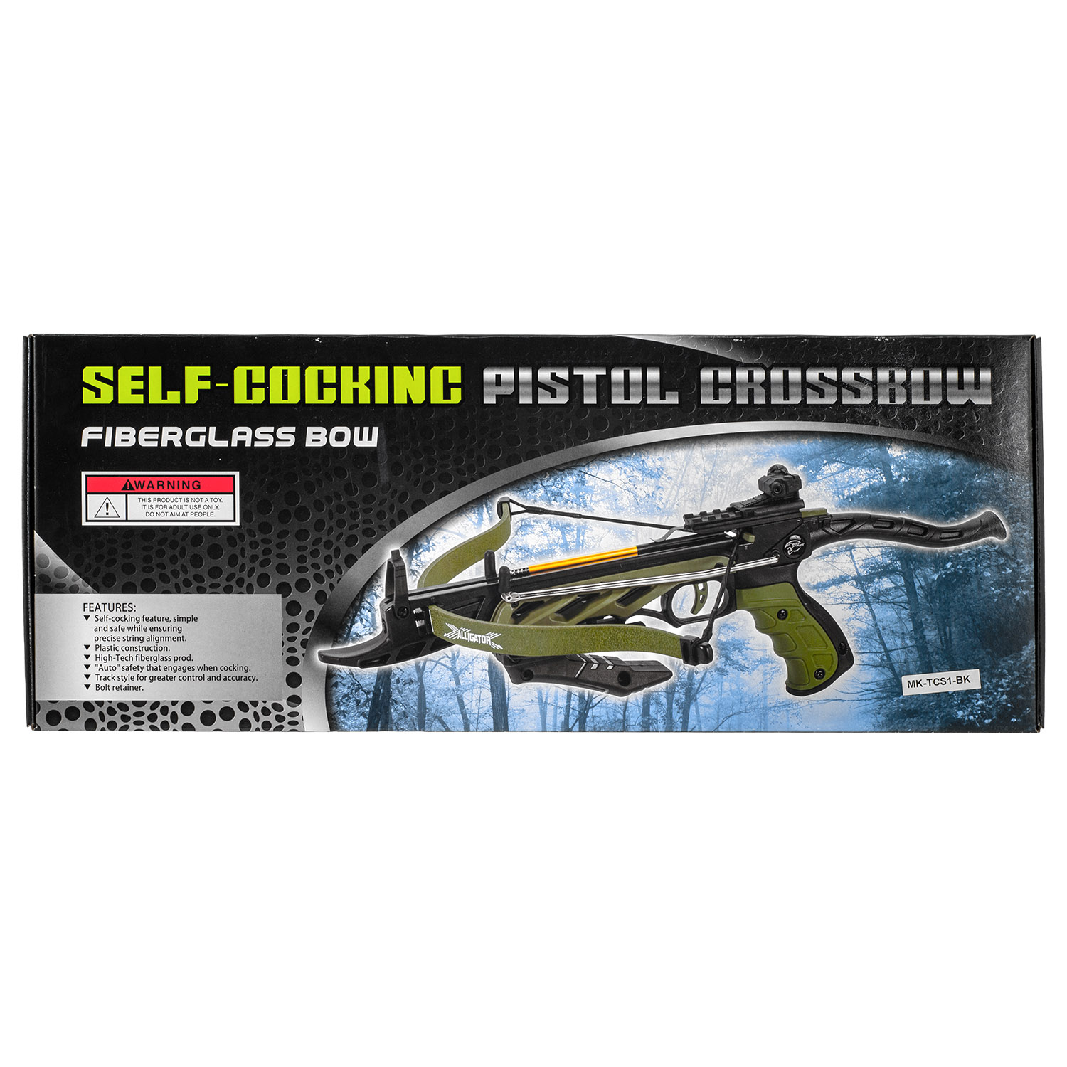 Product SummaryExperience precision and power in a portable package with the 80-lb. Alligator MK-TCS1-BK Self-Cocking Pistol Crossbow with 3 Arrows - Black, engineered for enthusiasts seeking reliable performance on the go. This compact recurve crossbow boasts a self-cocking mechanism that simplifies loading, paired with a high-impact plastic body for rugged durability during outdoor adventures. Delivering an impressive 185 feet per second velocity, it ensures accurate shots up to 20 meters, making it ideal for target practice or small game hunting. The high-tech fiberglass limbs provide consistent draw strength at 80 pounds, while the included trio of 6.5-inch aluminum arrows gets you shooting right out of the box. Effortless Self-Cocking MechanismThe innovative self-cocking design allows for quick and safe bolt loading with minimal effort, reducing fatigue and enhancing safety compared to traditional manual cocking crossbows on the market. Rugged High-Impact Plastic BodyConstructed from tough, lightweight plastic, the body withstands rough handling and harsh environments, providing exceptional resilience without the added bulk of metal alternatives. Advanced Fiberglass Limbs for Superior PowerThese high-tech fiberglass limbs deliver a potent 80-pound draw weight and 185 FPS speed, ensuring flatter trajectories and greater impact for precise, effective shots every time. Versatile Picatinny Rails for CustomizationEquipped with 20mm Picatinny rails on both upper and lower positions, this crossbow supports easy attachment of scopes, lights, or lasers, allowing personalized setups for varied shooting scenarios. Complete Kit with Precision Aluminum ArrowsReady for immediate use, the package includes three 6.5-inch aluminum arrows optimized for this model's 6-inch power stroke, offering sharp broadheads and reliable flight for consistent performance. Features