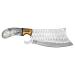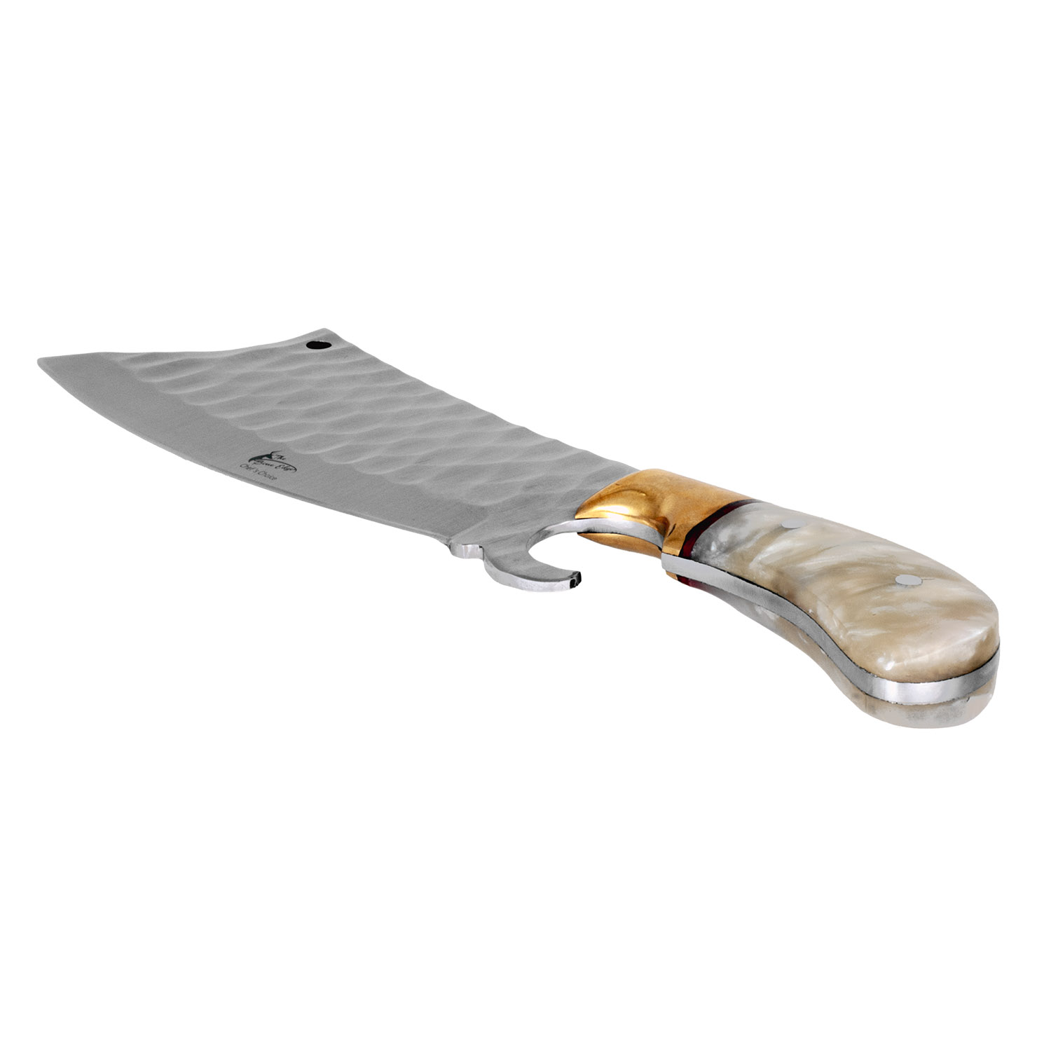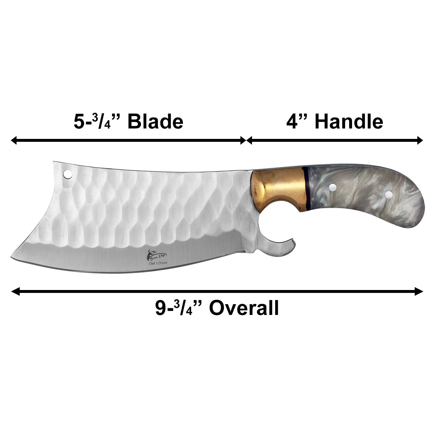 Product SummaryElevate your kitchen performance with the 9-3/4" The Bone Edge Chef's Choice Cleaver Knife, a powerful and stylish tool designed for effortless chopping, slicing, and dicing. This handcrafted cleaver combines rugged durability with elegant aesthetics, featuring a stunning white pearl handle that provides a comfortable, secure grip during heavy use. Forged from high-quality 420 stainless steel with full tang construction, it delivers exceptional strength, balance, and long-lasting sharpness for both professional chefs and home cooks. Complete with a genuine leather belt sheath for safe storage and easy portability, this cleaver stands out as a versatile essential that blends functionality with eye-catching craftsmanship. Perfect for tackling large cuts of meat, vegetables, and more with precision and confidence. Striking White Pearl HandleThe luxurious white pearl handle offers a sophisticated look and ergonomic comfort, ensuring a firm, non-slip grip even during extended chopping sessions. 420 Stainless Steel Full Tang BladeCrafted from premium 420 stainless steel with full tang construction, the blade provides superior strength, corrosion resistance, and reliable edge retention for demanding kitchen tasks. Generous Cleaver DesignFeaturing a wide, heavy-duty cleaver-style blade, this knife excels at breaking down meat, crushing garlic, and handling large ingredients with ease and precision. Genuine Leather Belt Sheath IncludedThe included handcrafted genuine leather sheath protects the blade and allows convenient belt carry or safe storage, adding practical value to this premium cleaver. Handcrafted Quality from PakistanExpertly handcrafted in Pakistan, this cleaver showcases traditional artistry combined with modern durability, making it a standout choice for serious cooks and collectors alike. Features