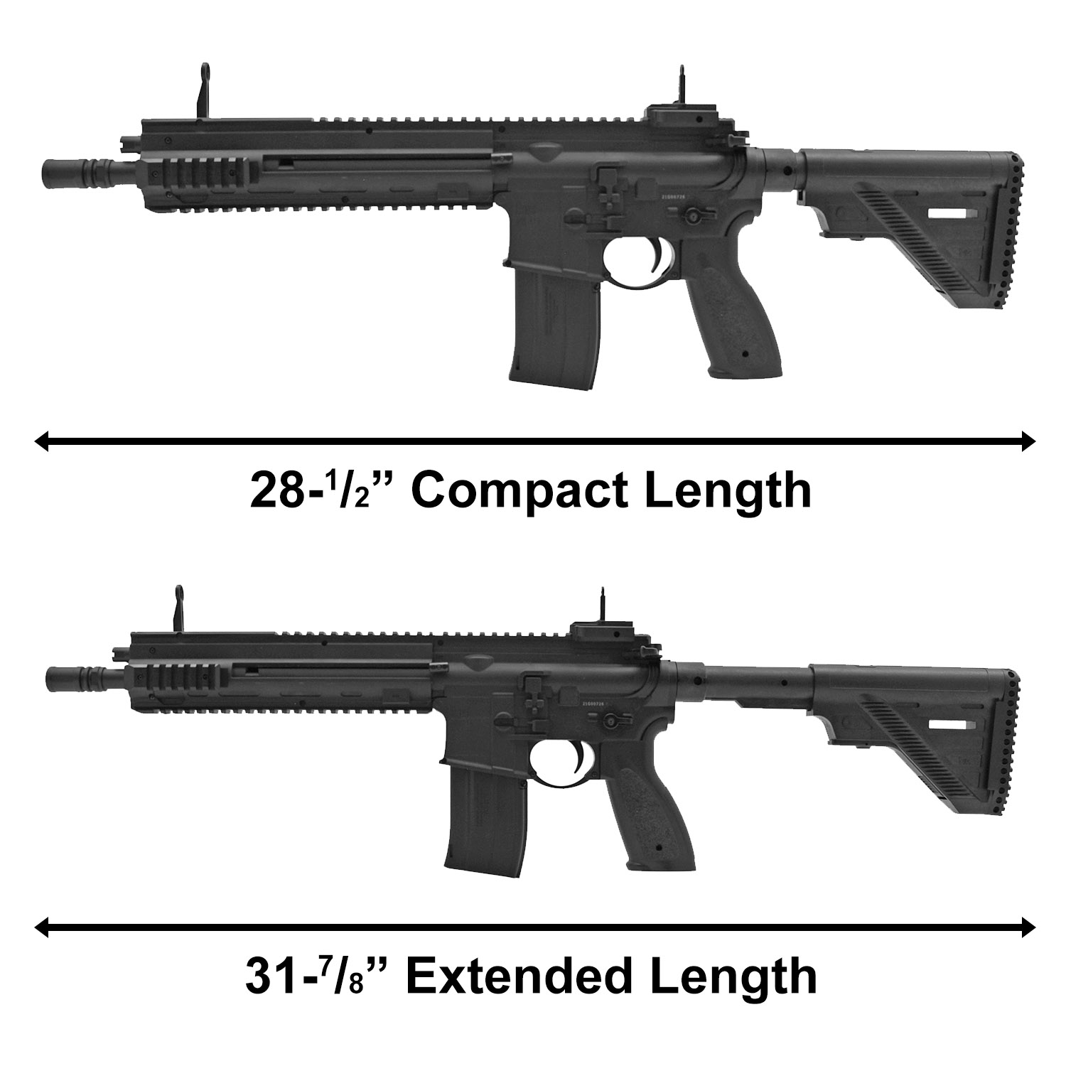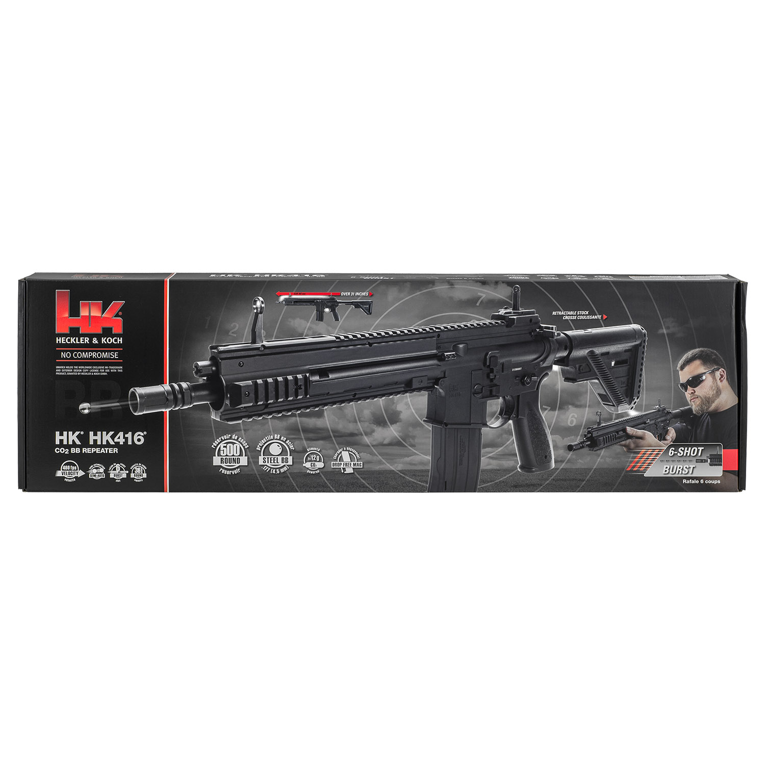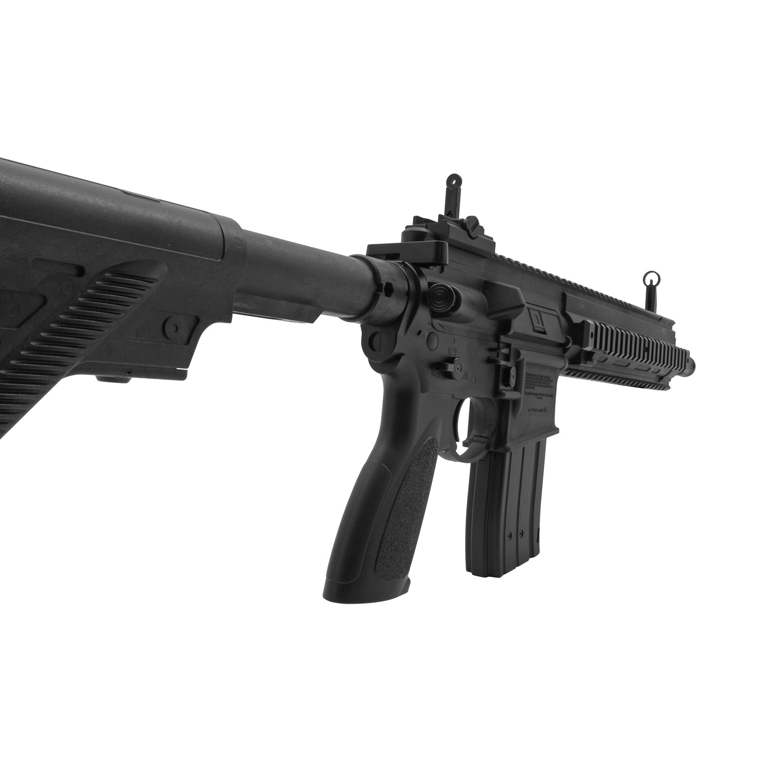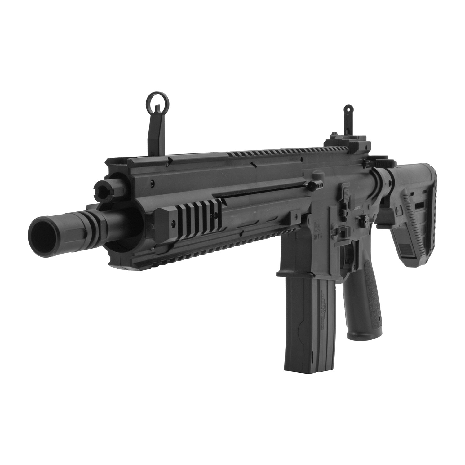 Product SummaryExperience realistic tactical shooting with the Heckler and Koch HK416 .177 Cal CO2 Powered BB Air Rifle, designed to replicate the look and feel of the iconic AR-15 platform. Powered by two 12g CO2 cartridge, this air rifle delivers consistent performance with velocities up to 460 feet per second for backyard training or recreational shooting. Its versatile firing modes include both single shot precision and an exciting 6 round burst option for added realism. A high capacity magazine system allows extended shooting sessions with minimal reloading interruptions. Built with multiple accessory rails and adjustable features, this rifle is ideal for enthusiasts seeking a tactical style BB gun with reliable performance and modern functionality. CO2 Powered Performance with Dual Firing ModesThis BB air rifle operates using a standard 12g CO2 cartridges, providing steady power and smooth shooting with the option to switch between single shot accuracy or a 6 round burst mode for rapid fire action. High Capacity Magazine SystemDesigned for extended use, the magazine holds up to 500 BBs with 36 rounds staged in the feeding position, reducing reload frequency and keeping you focused on shooting. Tactical Design with Accessory RailsEquipped with multiple Picatinny rails, this rifle allows easy customization with optics, lights, grips, and other accessories to match your preferred setup. Adjustable Stock and Flip Up SightsThe adjustable stock provides a comfortable fit for different shooters, while the integrated flip up iron sights offer quick target acquisition and dependable aiming. Realistic Build and Durable ConstructionModeled after the HK416 platform, this air rifle features a solid build and authentic styling that appeals to collectors and shooting enthusiasts alike. Features