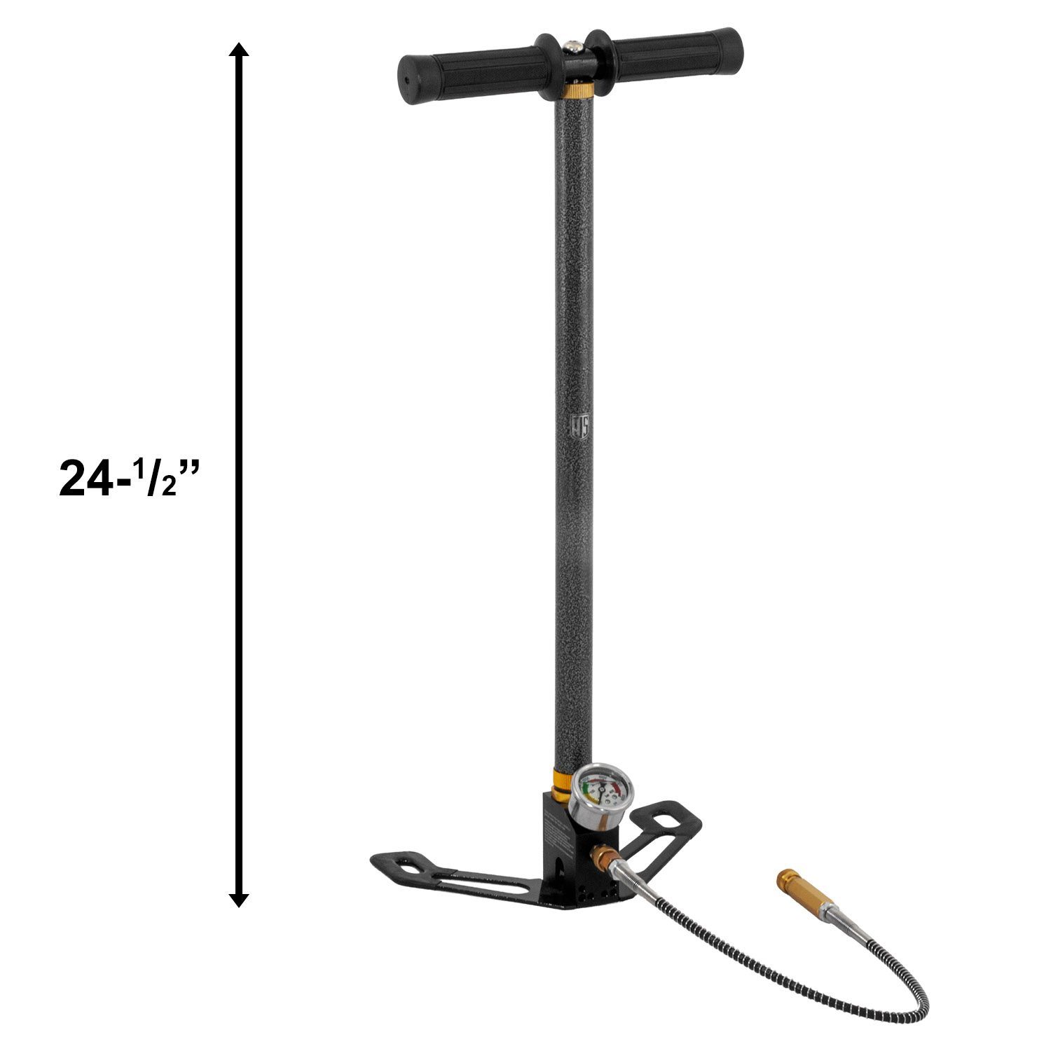 Product SummaryElevate your PCP airgun experience with the JTS Airguns JAC020 HP1 Hand Pump, a robust and efficient solution designed for airgun enthusiasts who need reliable high-pressure filling without electricity. This 2-stage hand pump delivers up to 4,500 PSI, making it ideal for filling pre-charged pneumatic rifles and pistols quickly and effectively. Built with durable powdercoated full metal construction, it offers excellent longevity and resistance to wear during regular use. The foldable base enhances portability and stable operation, while the integrated gauge allows precise pressure monitoring. Complete with a 24 inch long hose and a full replacement O-ring kit, this pump provides everything needed for convenient field or home maintenance. 2-Stage High-Pressure DesignThe efficient 2-stage pumping system reduces effort at higher pressures, allowing you to reach up to 4,500 PSI more comfortably and faster compared to single-stage models. Durable Powdercoated Full Metal ConstructionCrafted entirely from metal with a tough powdercoat finish, this pump withstands heavy use and environmental conditions for long-term reliability. Foldable Base for Stability and PortabilityThe innovative foldable base provides a secure, wide stance during pumping and folds compactly for easy storage and transport to the range or field. Built-in Gauge and Long HoseFeatures an easy-to-read pressure gauge for accurate filling and a generous 24-1/2 inch flexible hose that reaches airgun fill ports conveniently without strain. Includes Full Replacement O-Ring KitComes with a complete O-ring replacement kit to maintain peak performance over time and extend the pump's service life. Features