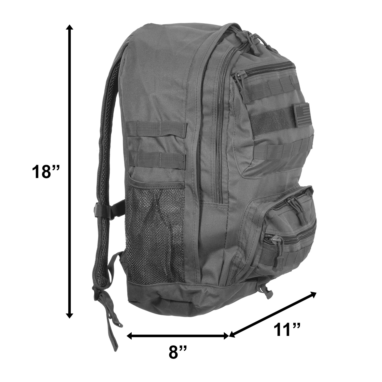 Product SummaryElevate your outdoor adventures and tactical pursuits with the rugged Shadow Gear Tactical 600D Military Training MOLLE Backpack, engineered for durability and versatility in demanding environments. Crafted from heavy-duty 600 Denier Polyester with a water-resistant PVC coating, this assault pack withstands the elements while offering ample space for gear organization. The integrated MOLLE webbing system allows seamless attachment of pouches and accessories, making it a go-to choice for hikers, campers, and military enthusiasts alike. Featuring padded shoulder straps, a secure chest buckle, and convenient side water bottle holders, it ensures all-day comfort without compromising on functionality. Topped off with a patriotic US Flag patch, this backpack blends practical performance with a bold statement of style. Durable 600D Polyester Construction with Water-Resistant PVC CoatingBuilt to endure rigorous use, the 600 Denier Polyester fabric provides superior tear resistance and longevity, while the PVC coating repels moisture to keep your essentials dry during unexpected rain or rough terrain. Versatile MOLLE Strap System for Custom Gear AttachmentThe full-body MOLLE webbing enables easy customization, allowing you to mount additional pouches, holsters, or tools directly onto the backpack for a tailored loadout that adapts to your mission. Ergonomic Padded Shoulder Straps and Chest Buckle StrapExperience load-bearing comfort with thickly padded shoulder straps that distribute weight evenly, complemented by an adjustable chest buckle that stabilizes the pack during extended hikes or training sessions. Patriotic US Flag Patch and Integrated Water Bottle HoldersShow your pride with the embroidered US Flag patch on the front, paired with dual mesh side pockets designed specifically for securing water bottles or small items, enhancing accessibility on the go. Spacious Multi-Compartment Design for Organized StorageMultiple zippered compartments, including a large main area and front pockets, offer organized storage for everything from clothing and tools to hydration bladders, maximizing efficiency in a compact footprint. Features