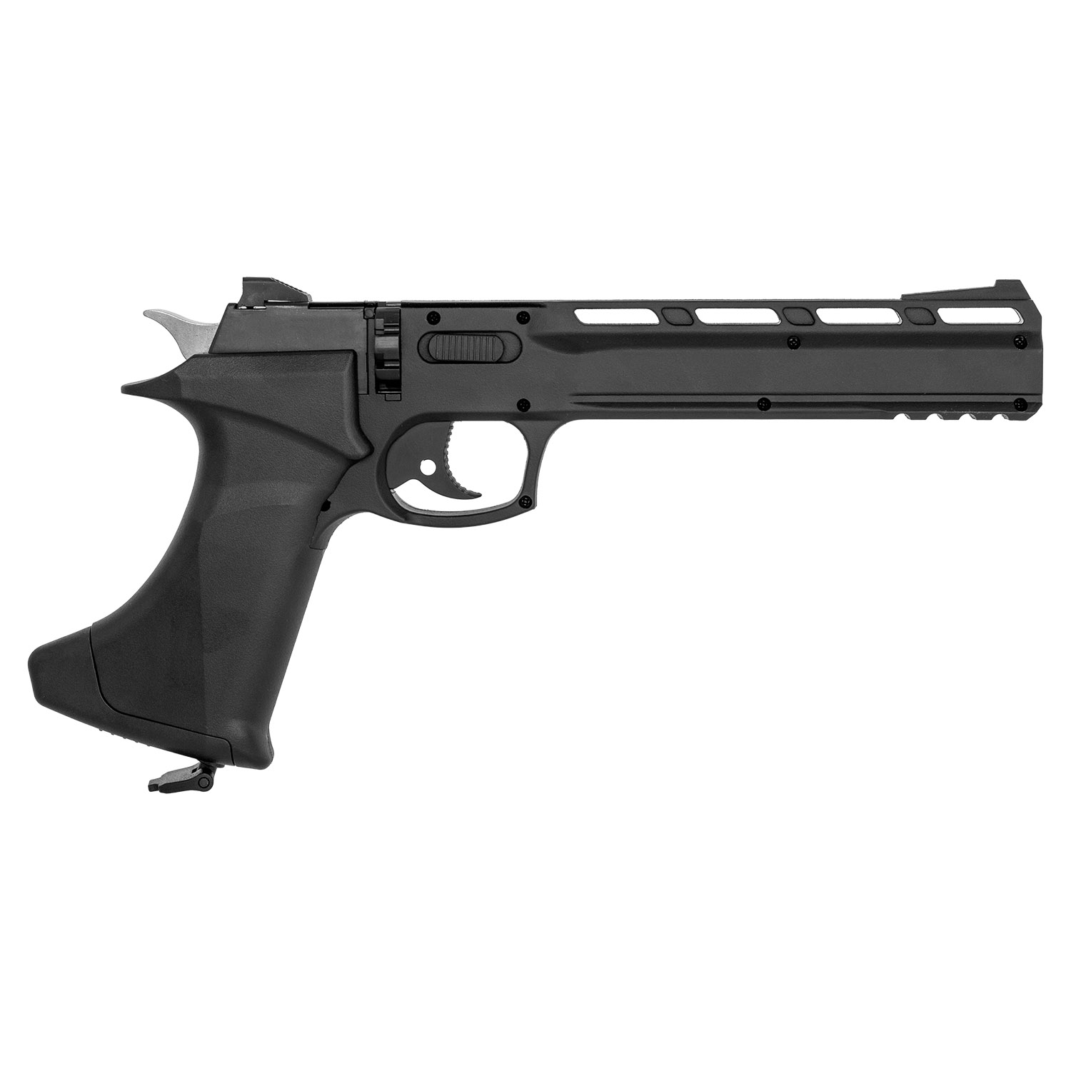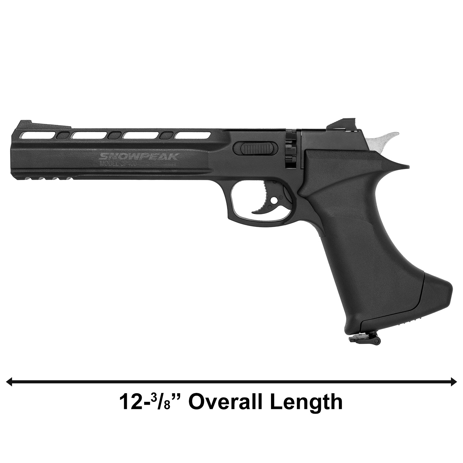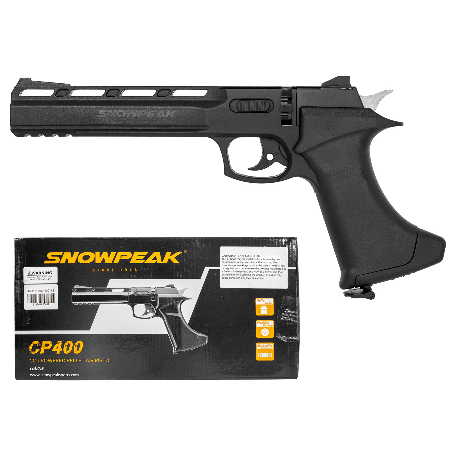 Product SummaryExperience fast and fun shooting with the Snowpeak Artemis CP400 .177 Cal. CO2 Air Pellet Pistol, a reliable semi-automatic airgun built for target practice and recreational plinking. Powered by a standard 12-gram CO2 cartridge, this pistol delivers consistent performance with velocities up to 400 FPS using lightweight pellets. Its high-impact polymer construction provides a lightweight yet durable frame, weighing approximately 600 grams for comfortable handling during extended sessions. The ergonomic black synthetic grip ensures a secure hold, while the tactical design includes a Picatinny rail for easy mounting of accessories. Perfect for beginners and enthusiasts alike, this CO2 pistol combines affordability with impressive semi-auto capability and accuracy for enjoyable backyard or indoor shooting. Semi-Automatic CO2 Powered ActionPowered by 12-gram CO2 cartridges, this pistol offers smooth semi-automatic firing without manual cocking between shots, allowing quick follow-up shots and an exciting shooting experience with double action only trigger. High Velocity and AccuracyAchieving velocities up to 400 FPS in .177 caliber, the rifled barrel delivers impressive power and precision for .177 pellets, making it ideal for target shooting and plinking at various distances. 8-Round Magazine and Easy LoadingFeatures an 8-shot rotary magazine (2 magazines included) for multi-shot convenience, enabling rapid reloading and sustained fire without interruption during your shooting sessions. Durable High-Impact Polymer BuildConstructed with tough black polymer materials and a balanced design, the CP400 offers lightweight handling at around 600 grams while maintaining rugged durability for regular use. Accessory Ready with SightsEquipped with adjustable open sights for accurate aiming and a built-in Picatinny rail under the barrel for adding lights, lasers, or other accessories to customize your setup. Features