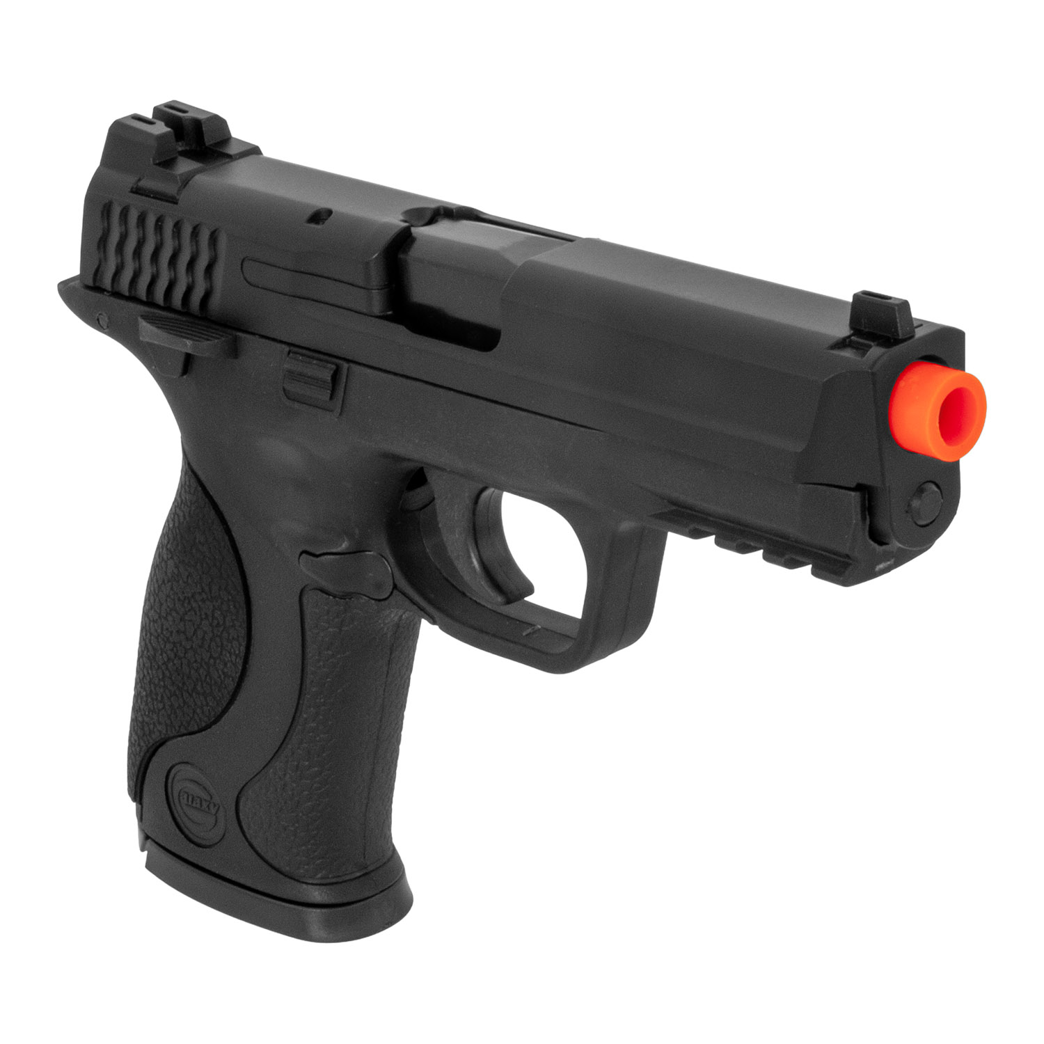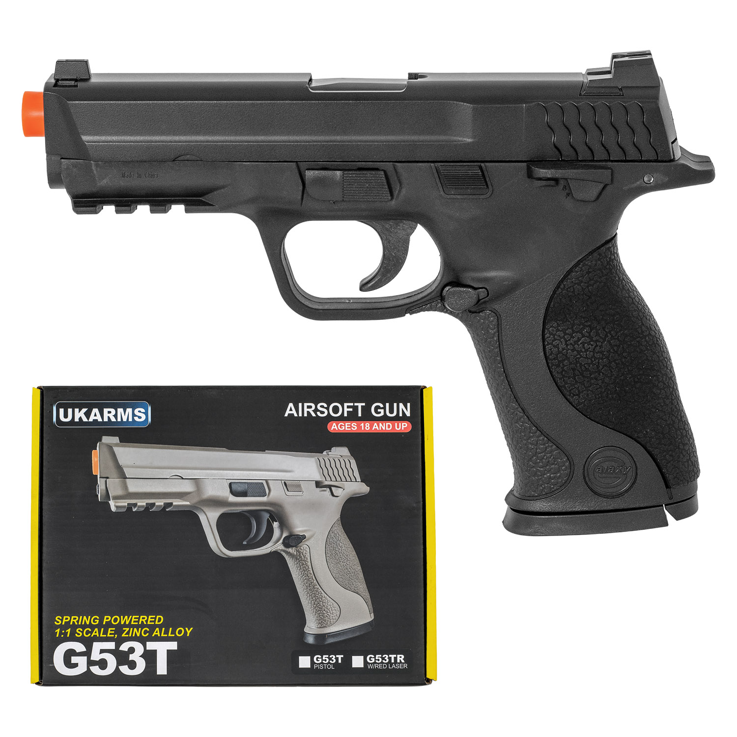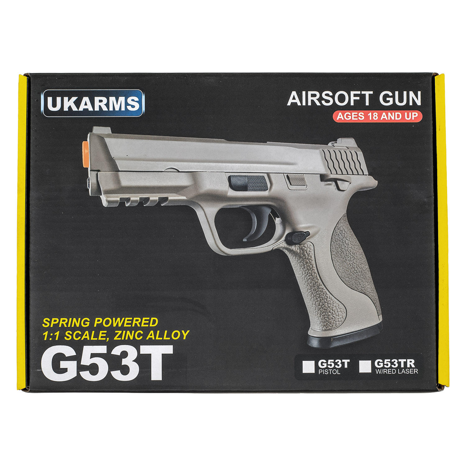 Product SummaryExperience authentic airsoft action with the UKARMS G53B Metal Slide Spring Powered Airsoft Pistol, a full-size replica designed for precision and reliability in every shot. Its robust zinc alloy slide delivers a lifelike weight and smooth racking motion, enhanced by textured edges for effortless operation during intense play. Powered by a dependable spring mechanism, this pistol achieves impressive 210-220 FPS muzzle velocity, making it a top choice for target shooting or tactical training. The ergonomic polymer grip ensures comfortable handling, while the 14-round magazine keeps you in the fight longer without constant reloading. Complete with starter BBs, the G53B offers immediate out-of-the-box readiness, blending affordability with professional-grade features for airsoft enthusiasts at any level. High-Impact Spring Powered ActionThe spring-powered single-shot mechanism provides consistent performance and requires no batteries, ensuring reliable operation in any environment for extended airsoft sessions. Durable Zinc Alloy Metal SlideCrafted from high-quality zinc alloy, the full metal slide offers realistic heft and superior durability, mimicking the feel of a genuine firearm while withstanding rigorous use. Impressive 210-220 FPS Muzzle VelocityDelivering velocities between 210-220 FPS with 0.12g BBs, this pistol packs enough power for accurate shots at range, ideal for competitive play or skill-building practice. 14-Round Magazine CapacityEquipped with a 14-round magazine, the G53B allows for sustained firing without frequent interruptions, enhancing your tactical advantage in fast-paced airsoft scenarios. Compact 7-3/4 Inch Overall LengthMeasuring just 7-3/4 inches in overall length, this pistol strikes the perfect balance between maneuverability and presence, fitting seamlessly into holsters or hands during dynamic engagements. Features