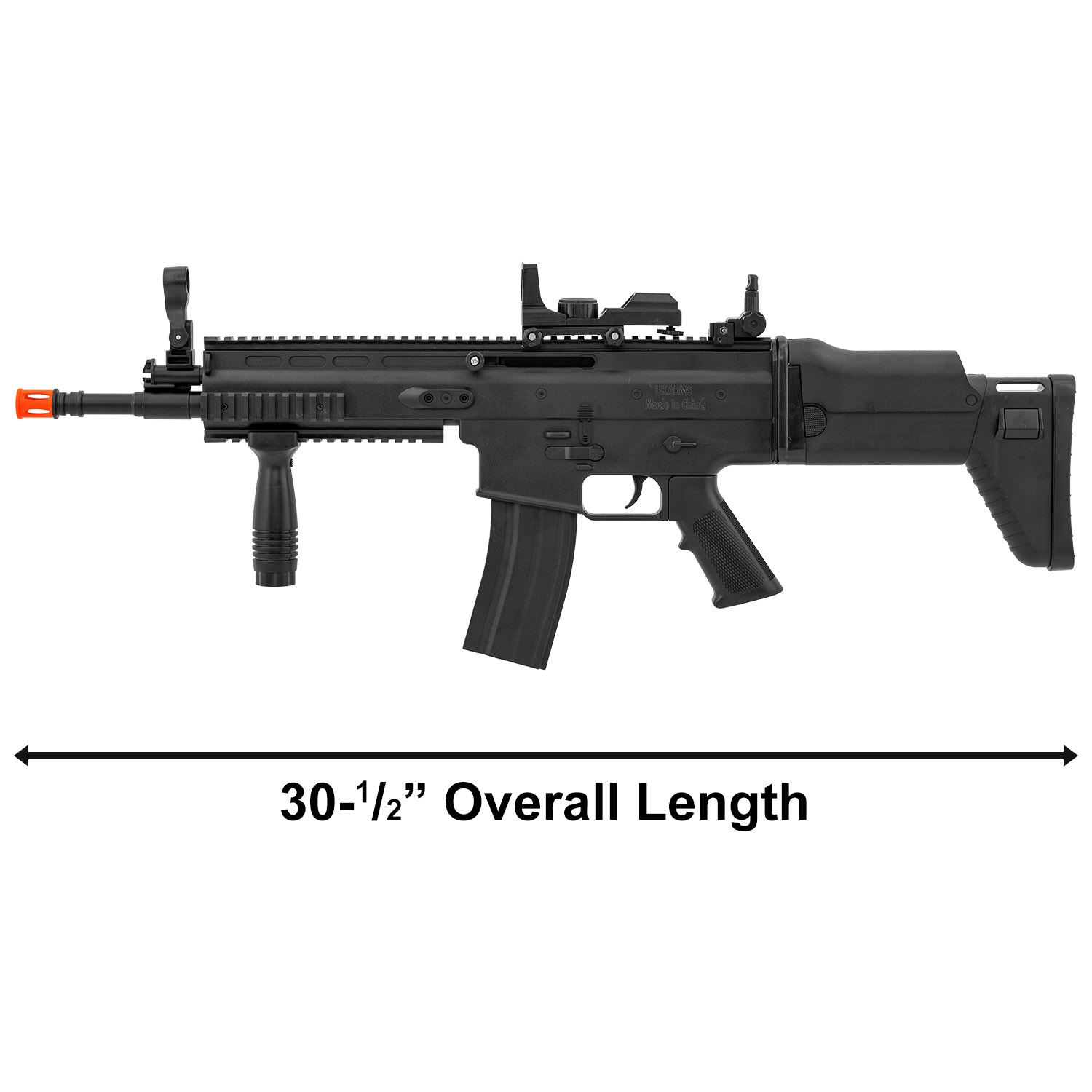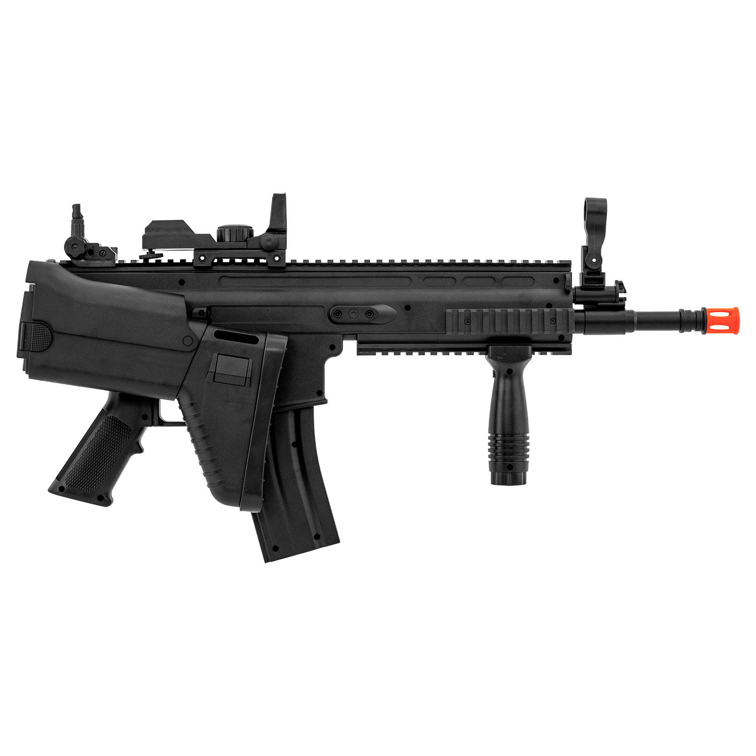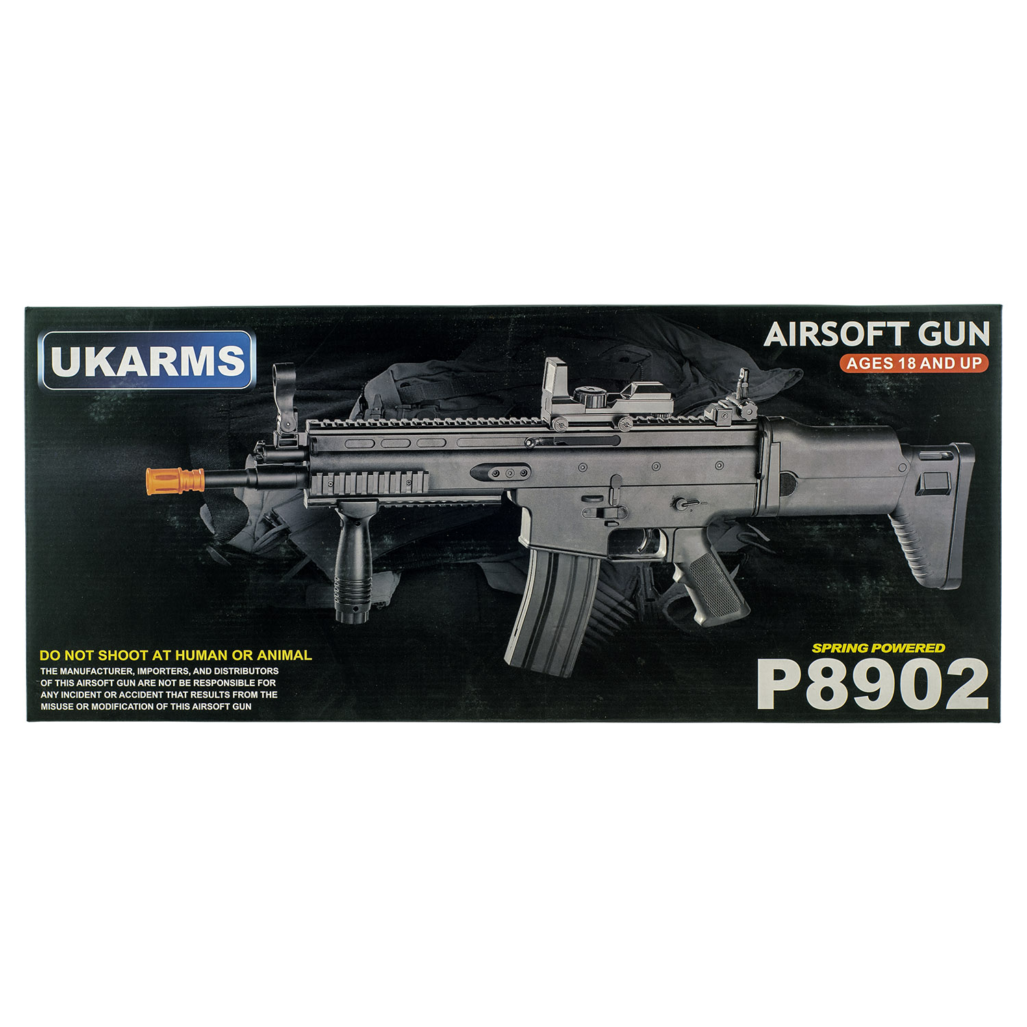 Product SummaryExperience tactical precision with the UKARMS P8902 MK16 Spring Powered Airsoft Gun, a full-scale 1:1 replica that captures the iconic SCAR-L design for immersive backyard battles or display. Built from lightweight yet rugged ABS polymer, this spring-action rifle propels 0.12g BBs at 310-330 FPS, delivering reliable velocity for beginners honing their marksmanship skills. Its adjustable folding stock and ergonomic vertical foregrip ensure comfortable handling across various scenarios, while the included red dot sight enhances target acquisition for quick, accurate shots. The generous 150-round hi-cap magazine minimizes downtime, allowing extended sessions of fun without frequent reloads. Complete with sample 6mm BBs and versatile rail systems for customization, this airsoft gun stands out as an entry-level powerhouse blending authenticity and affordability. High-Velocity Spring Mechanism for Consistent PerformancePowered by a robust spring system, the UKARMS P8902 achieves 310-330 FPS with 0.12g BBs, providing the ideal balance of power and safety for casual target practice or introductory airsoft play. This velocity ensures satisfying range without overwhelming recoil, making it a top choice for newcomers seeking reliable shot-to-shot consistency. Adjustable Folding Stock and Ergonomic DesignThe SCAR-inspired folding and retractable stock adapts to your shooting stance, collapsing to a compact 22.8 inches for storage or extending to a full 30.5 inches for stability during extended use. Paired with a textured vertical foregrip, it offers superior control and reduces fatigue, outperforming basic spring rifles in versatility. Integrated Red Dot Sight for Precision AimingOutfitted with a reflex red dot sight and flip-up "iron" backups, this airsoft gun simplifies sighting in fast-paced scenarios, giving you an edge over competitors' bare-bones models. The monolithic top rail further supports additional optics, turning it into a customizable platform for aspiring tacticians. High-Capacity Magazine and Accessory RailsLoaded with a 150-round hi-cap magazine, the P8902 keeps the action flowing during prolonged engagements, far surpassing standard spring gun capacities for uninterrupted fun. Its tri-rail fore-end invites tactical lights, lasers, or grips, elevating this affordable rifle to pro-level modularity. Features