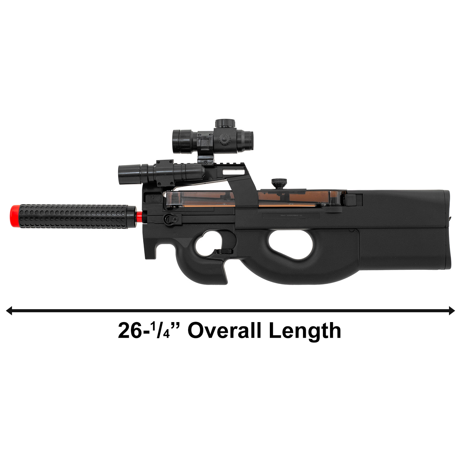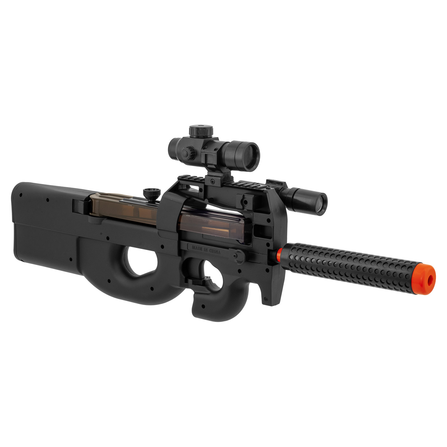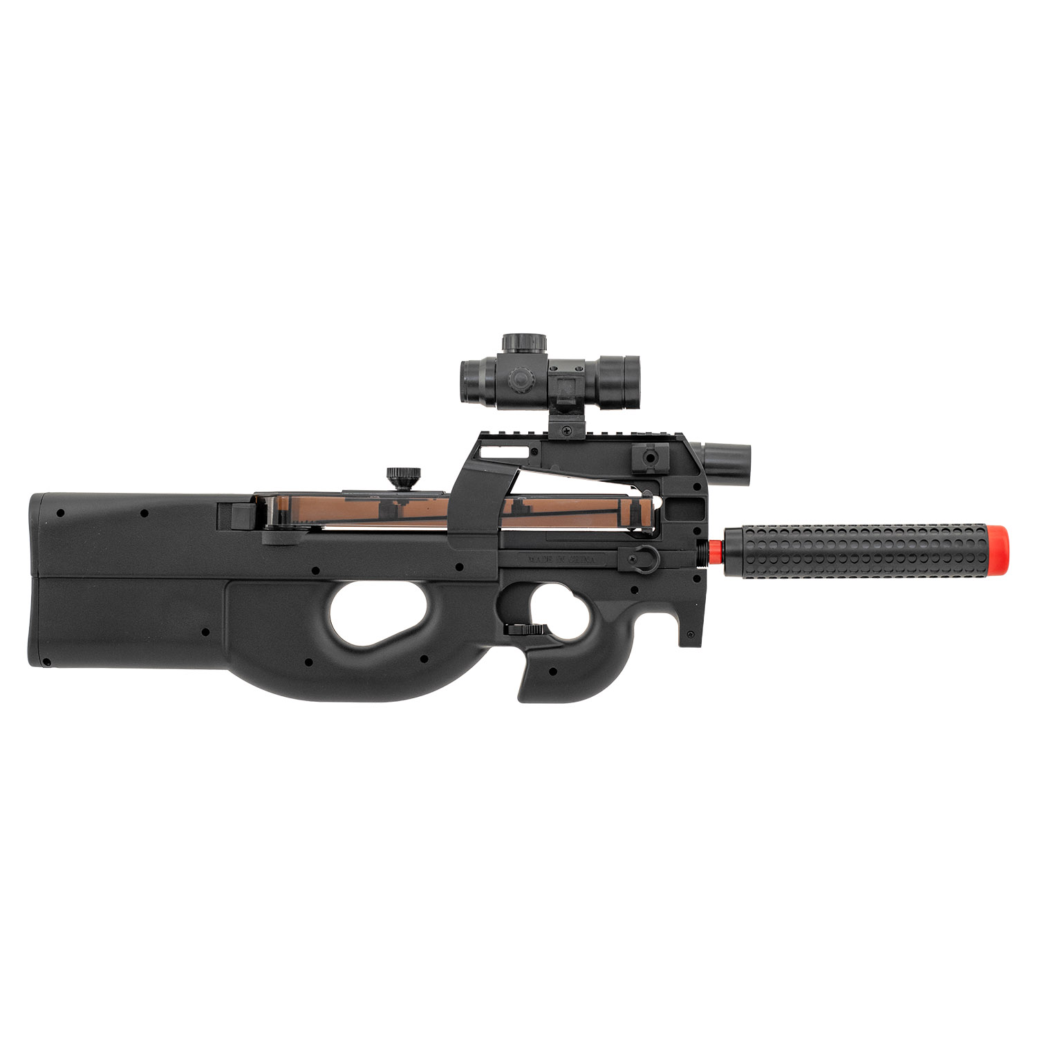 | Product SummaryExperience the thrill of tactical combat with the Well D90-H P90 Plastic Gear AEG Electric Airsoft Gun, a top-tier choice for airsoft enthusiasts seeking versatility and performance. This compact submachine gun boasts a rugged ABS plastic construction, paired with a high-capacity 400-round magazine that ensures uninterrupted gameplay. Equipped with a red dot scope and flashlight, it enhances targeting precision in any lighting condition, while the adjustable hop-up system allows for customized accuracy. Ideal for beginners and seasoned players alike, this airsoft gun delivers semi and full automatic firing modes, making it a dynamic addition to your arsenal. Dynamic Semi and Full Automatic FiringEnjoy the flexibility of both semi and full automatic firing modes, offering a realistic combat experience with rapid-fire capability at your fingertips. This feature caters to various play styles, from precise shots to intense barrages, enhancing your airsoft skirmishes. High-Capacity 400-Round MagazineThe included 400-round hi-cap magazine minimizes reload downtime, allowing you to stay engaged in the action longer and dominate the battlefield with consistent firepower. Its gravity-fed design ensures smooth BB delivery for seamless performance. Precision Targeting with Red Dot Scope and FlashlightThe integrated red dot scope and tactical flashlight provide superior targeting accuracy and visibility, even in low-light environments, giving you a competitive edge during close-quarters battles. These accessories are perfectly mounted for quick adjustments and reliable use. Adjustable Hop-Up for Customized Accuracy