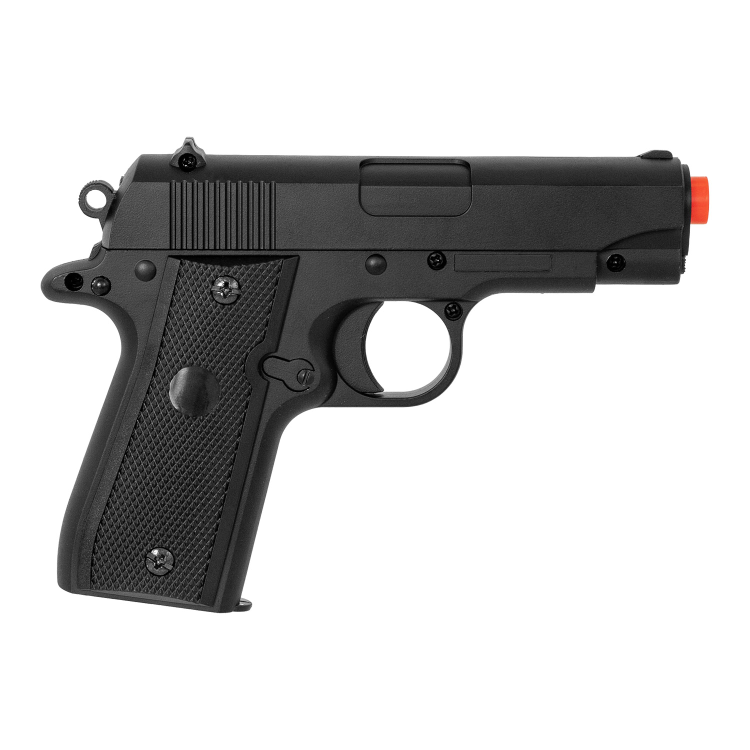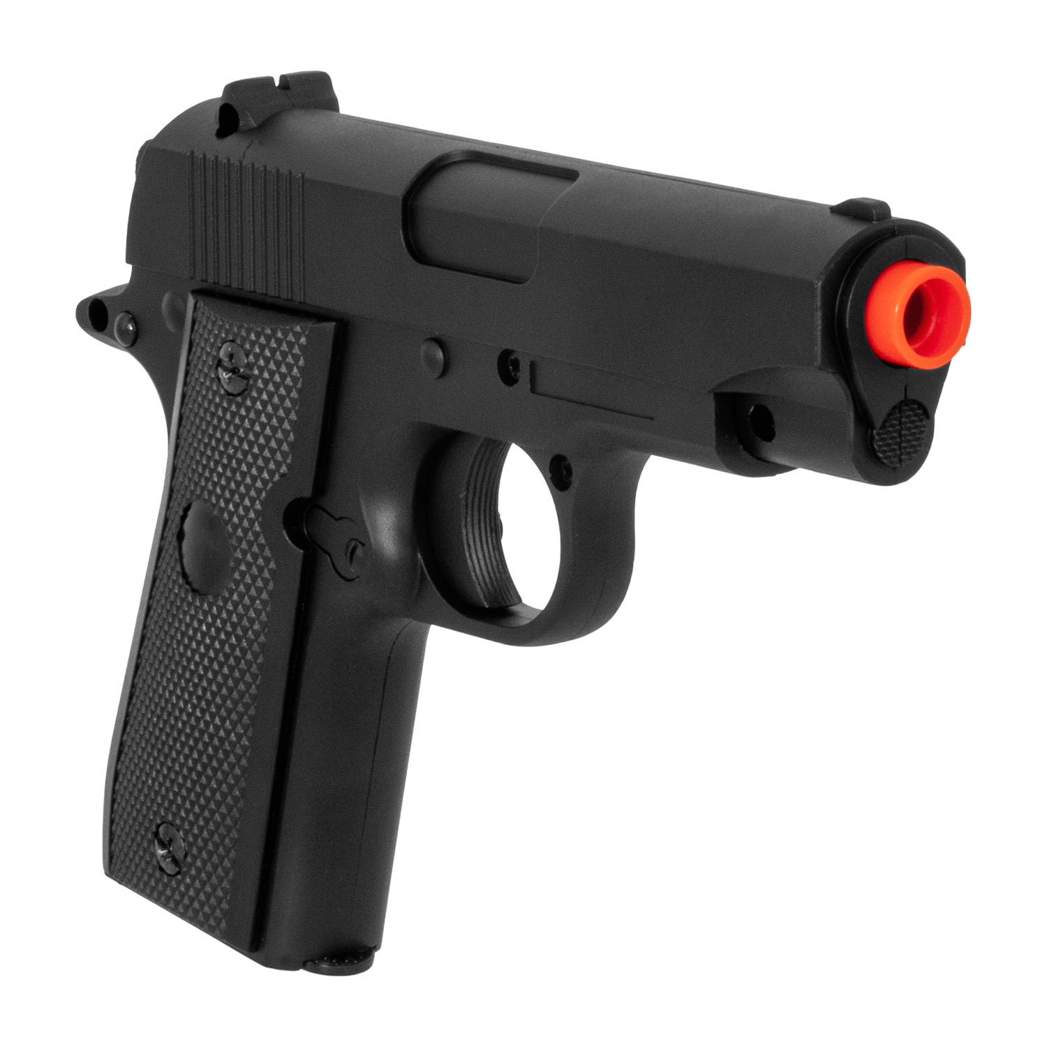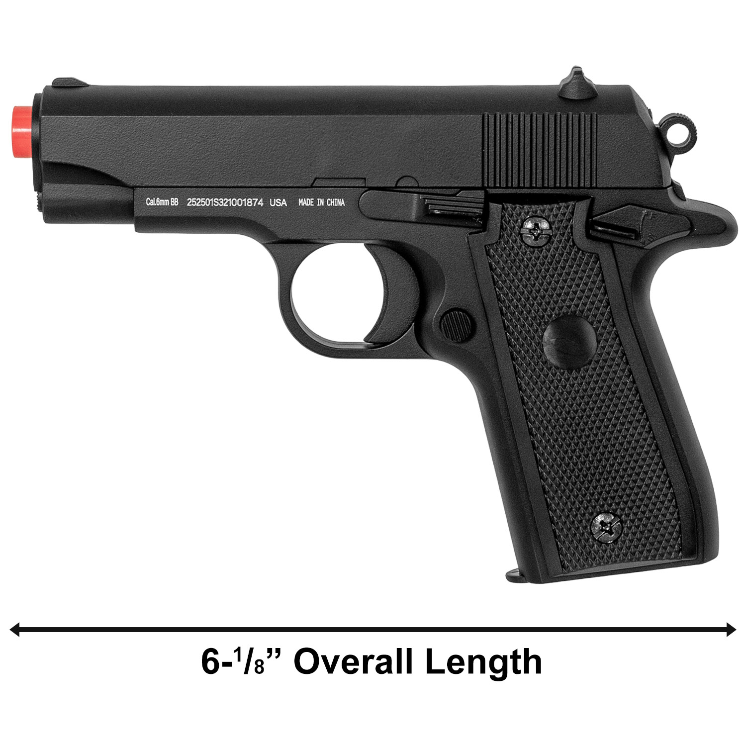 Product SummaryExperience reliable performance and effortless handling with the WellFire D88 Spring Powered Airsoft Pistol, a compact powerhouse designed for airsoft enthusiasts seeking a no-fuss backup weapon. Crafted from durable ABS plastic, this lightweight handgun delivers consistent 180-220 FPS shots without the need for batteries or gas, making it perfect for backyard skirmishes or target practice. Its realistic slide action mimics authentic pistol operation, while the textured grips ensure a firm hold during intense play. Equipped with built-in iron sights and a generous 19-round magazine, the D88 offers precision and extended shooting sessions in a sleek 6-1/8 inch frame that's easy to conceal and maneuver. Compact 6-1/8 Inch Overall LengthMeasuring just 6-1/8 inches in total length, the WellFire D88 provides exceptional portability and quick draw capabilities, ideal for close-quarters airsoft scenarios or as a secondary sidearm in larger engagements. Impressive 180-220 FPS Muzzle VelocityPowered by a robust spring mechanism, this pistol achieves muzzle velocities between 180-220 FPS with 0.12g BBs, ensuring accurate and impactful shots that stand out in competitive play without overwhelming recoil. 19-Round Magazine CapacityThe integrated 19-round magazine allows for prolonged firing sessions, reducing reload frequency and keeping you in the action longer compared to lower-capacity competitors. Spring-Powered Action for Hassle-Free OperationRequiring no external power sources, the spring-powered design guarantees dependable performance in any environment, from indoor arenas to outdoor fields, with simple cocking for immediate readiness. Built-In Iron Sights for Enhanced AccuracyFeaturing fixed iron sights, the D88 promotes straightforward target acquisition and improved shot placement, making it a top choice for beginners honing their marksmanship skills. Features